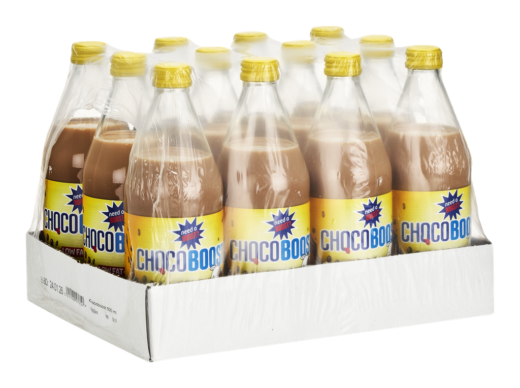 CHOCOBOOST is een verkwikkende en romige chocolademelk die perfect is als energieboost, tussendoortje of hersteldrank na het sporten. Het is een gesteriliseerde magere melkdrank met chocoladesmaak. De verpakking van 12 flessen van 50 cl maakt het ideaal voor gezinnen, kantines of voorraadbeheer.